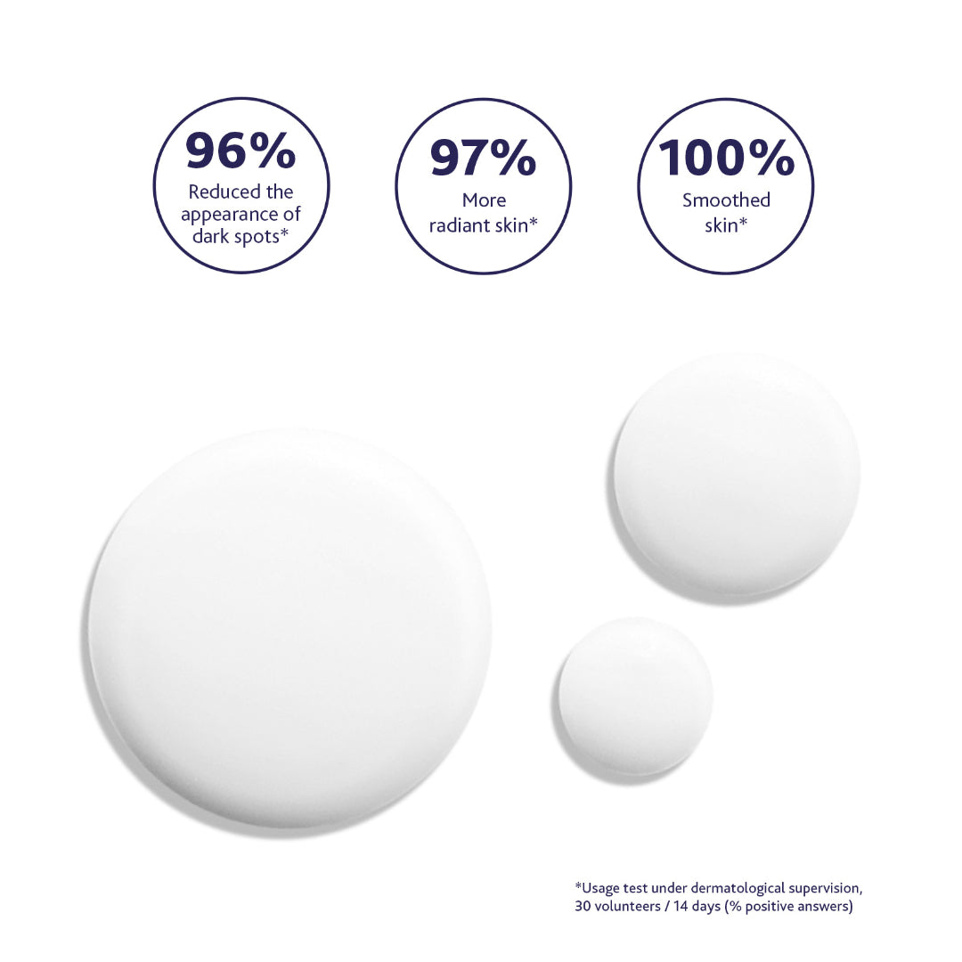 Reduces the appearance of dark spots, restores radiance to the complexion and smoothes the cutaneous miro-relief. 14-day intensive cure. Suitable for sensitive skin. Apply 1 pressure morning and evening to the face and neck. Shake well before each use.