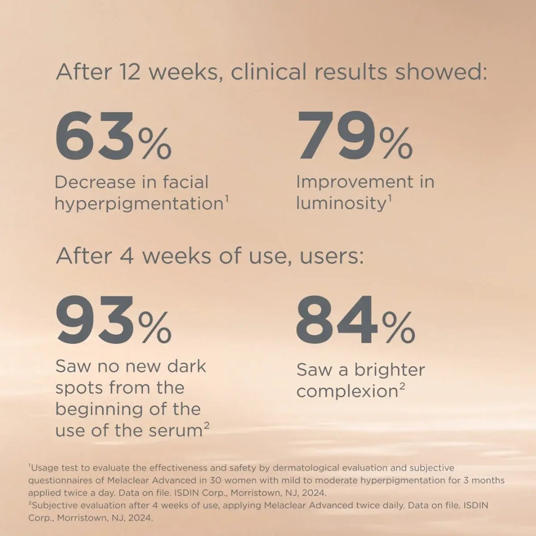 Fade and forget discoloration with Melaclear Advanced pigment-correcting serum. Daily use reduces dark spots with notable results as early as two weeks and remarkable results within 12 weeks. Achieve lasting radiance with this powerful blend of complexion-unifying ingredients, including tranexamic acid, niacinamide, and Spot Corrector Complex.